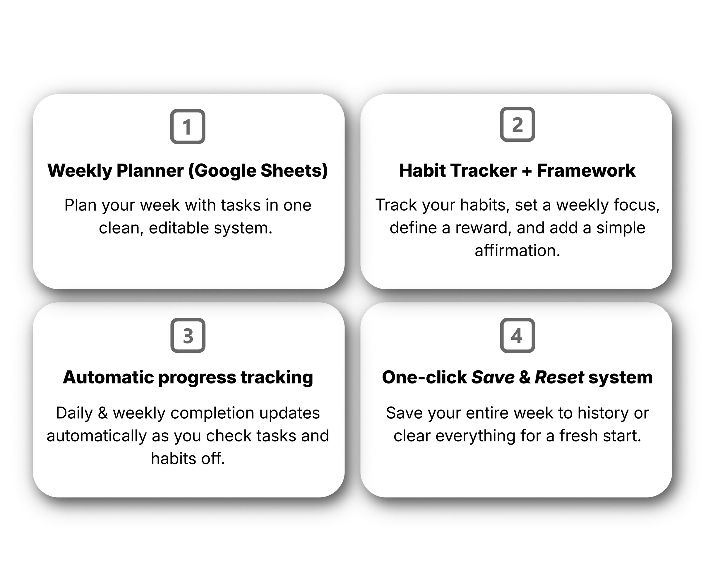 Weekly Focus, Reward & Affirmation – simple prompts to set your intention for the week and define your end-of-week reward