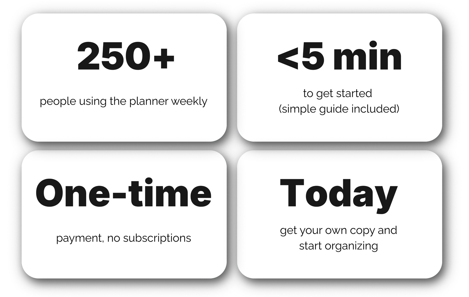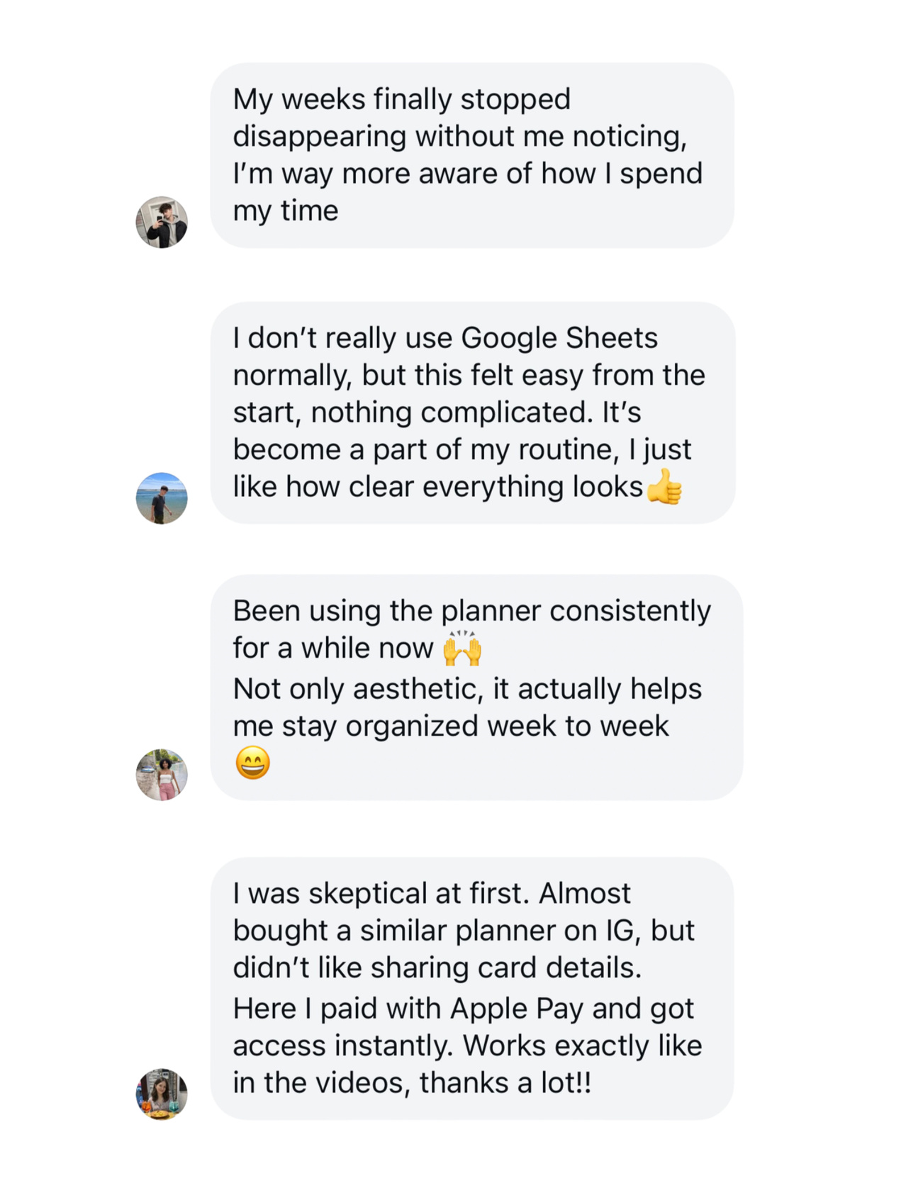 Save 💾 – archives your entire week into a clean history tab named after your start date